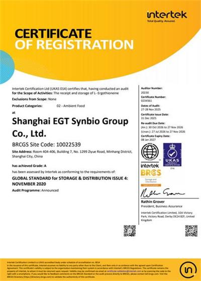 祝賀上海麥角硫因科技有限公司2025年快速通過BRC認(rèn)證并取得A級(jí)證書